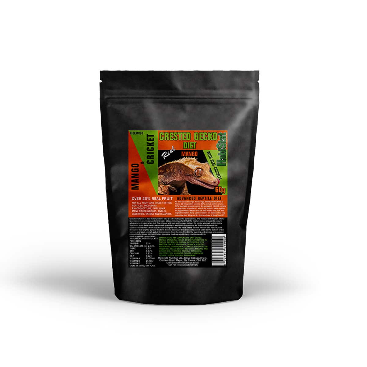 HabiStat Crested Gecko Diet avec des grillons est formulé sans l’ajout de colorants et d’arômes artificiels, de conservateurs et de charges. Il contient plus de 20% de vrais fruits et 9 sources de protéines majeures.